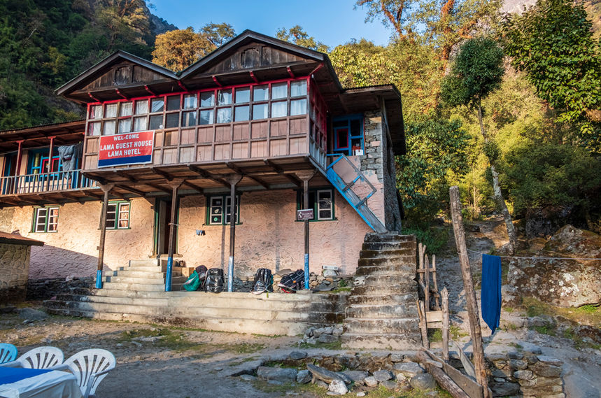 Unsere heutige Wanderung führt uns den Weg hinauf zu unserem Ziel, dem Lama Hotel (2.477 m). Dies ist kein einzelnes Hotel, sondern eine Ansammlung von Lodges und Häusern und unser Ziel für zwei Nächte. Dieses Gebiet ist von üppigen grünen Wäldern umgeben, die eine waldlagerähnliche Atmosphäre schaffen.